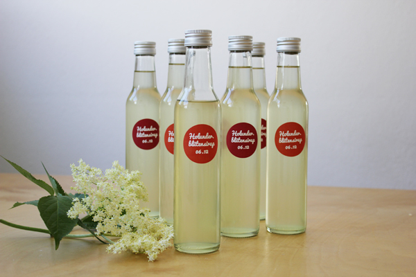 Schließlich den Sirup durch ein feines Sieb gießen, nochmal ein paar Minuten kochen lassen, in sehr saubere Flaschen füllen und diese gut verschließen. Ich habe 250ml-Flaschen vorn hier verwendet.