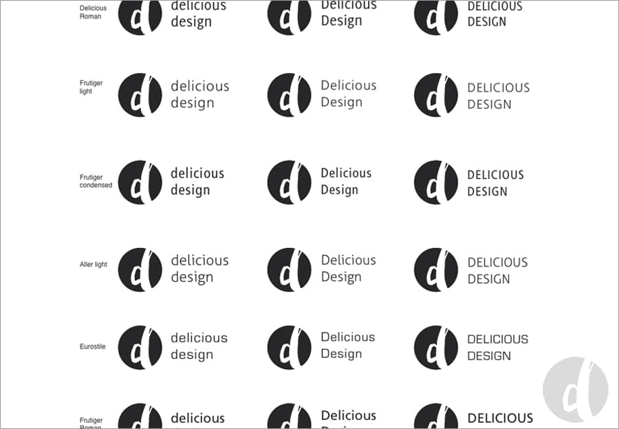 Ich habe also, nachdem der schwarze Kreis mit dem handgemalten „d“ feststand, mit verschiedenen Schriften für „delicious design“ herumprobiert