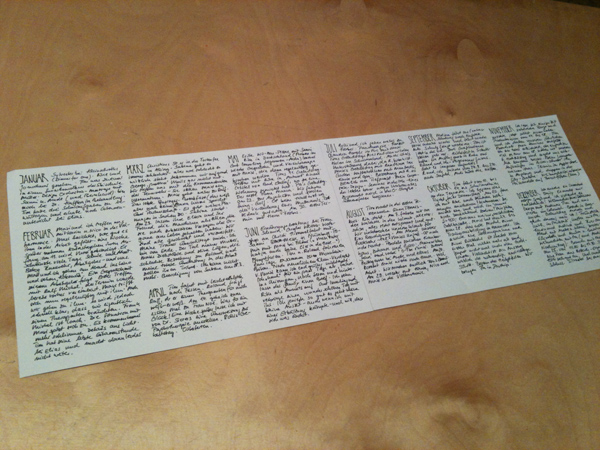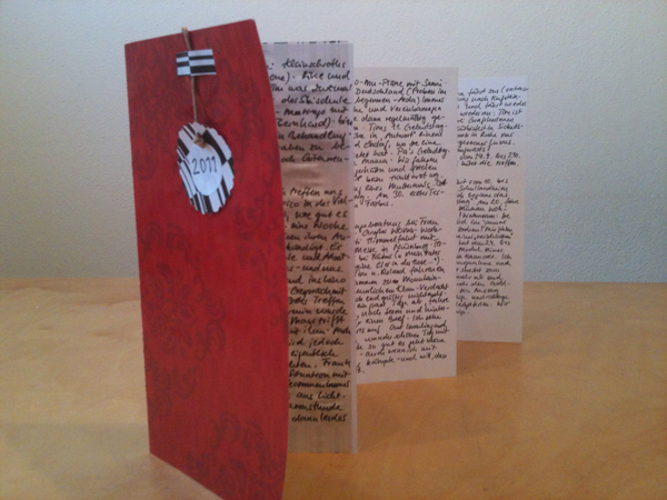 Für den Rückblick 2011 habe ich mich nach meinen Aufzeichnungen in meinem Kalender gerichtet und die Monate dann handschriftlich zusammengefasst. Um alle 12 Monate abbilden zu können klebte ich zwei A4-Blätter zusammen.